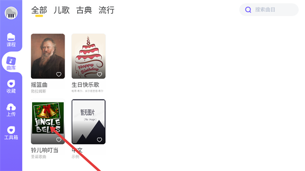 2、从曲库中挑选想要练习的目标曲目,例如《铃儿响叮当》,点击该曲目对应的条目就能进入曲目练习界面。