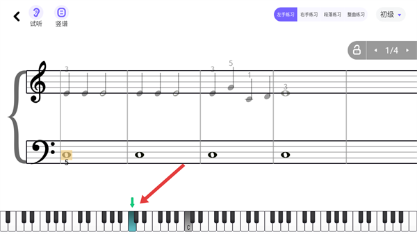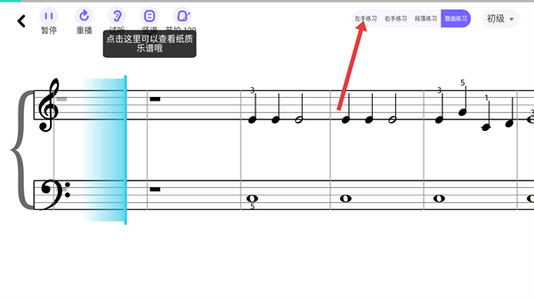 3、进入乐谱界面后,点击顶部的【左手练习】选项,即可切换到左手单独练习的模式。