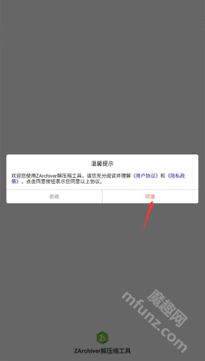 1. 打开ZArchiver软件后,需先阅读并同意用户服务协议与隐私条款,随后进入主界面。