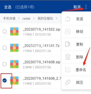 5、点击文件右上角的编辑图标,选中压缩文件后,点击右上角的三点图标,选择重命名选项。
