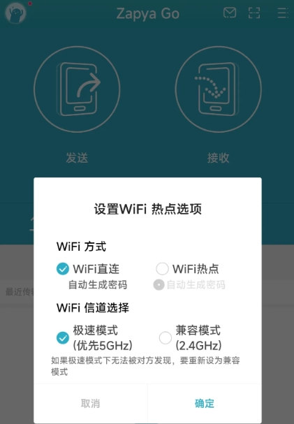 Part.2 开启“极速模式” 返回主界面后,点击右上角的按钮,进入“设置WiFi选项”,选择“极速模式”。在此模式下,文件传输速率会更快(温馨提示:需确保发送方和接收方的手机均支持5GHz WiFi,否则可能无法搜索到对方设备)。
