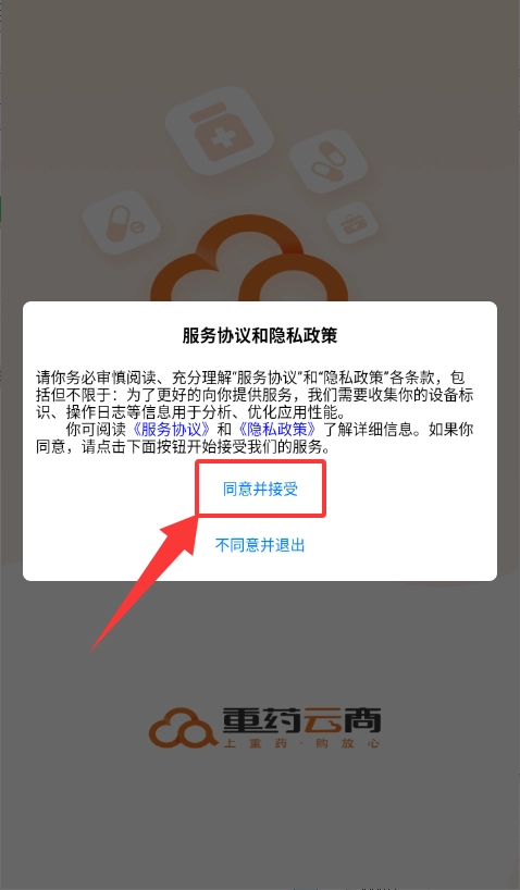 在服务协议与隐私政策的提示界面点击“同意并接受”按钮,就能进入应用程序。