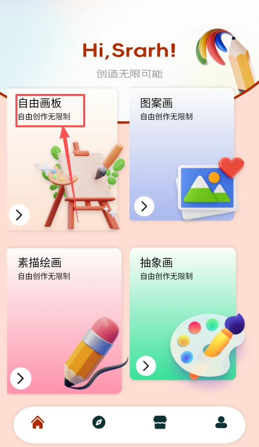 2、想要进行自由创作时,回到主页后点击“自由画板”“图案画”“素描绘画”或“抽象画”中的任意一个入口即可,这些模式均支持无限制的创作。