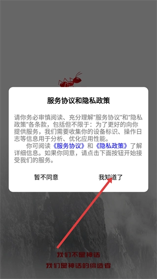 进入应用后,会弹出《服务协议和隐私政策》的提示,阅读相关条款后,点击“我知道了”按钮即可进入应用。