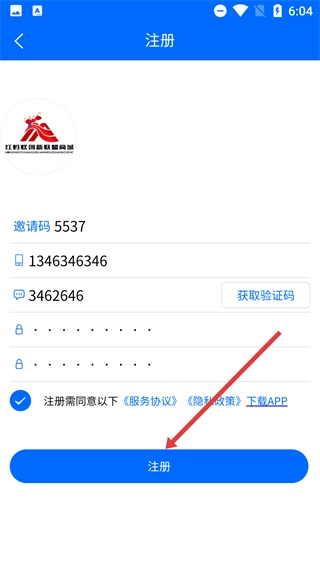 4、进入注册页面后,依次填写【邀请码】、【手机号】,获取并填写【验证码】,设置【密码】,勾选相关协议后点击【注册】按钮,即可完成账号注册流程。