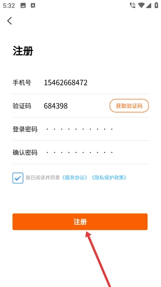 4、进入注册页面后,依次填写【手机号】与【验证码】,接着设置并确认密码,最后点击【注册】按钮,即可完成账号注册流程。