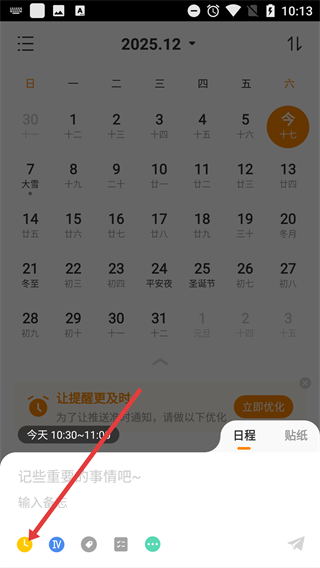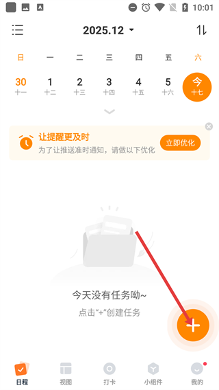 1、在【2025.12】的日程页面,看到“今天没有任务呦~”的提示后,点击右下角的【+】按钮,进入任务创建的操作界面。