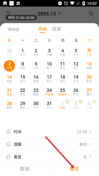 3、在日期选择面板选定任务日期,设置好日期和【21:30~22:00】的具体时间范围后,点击【确定】按钮即可完成时间配置。