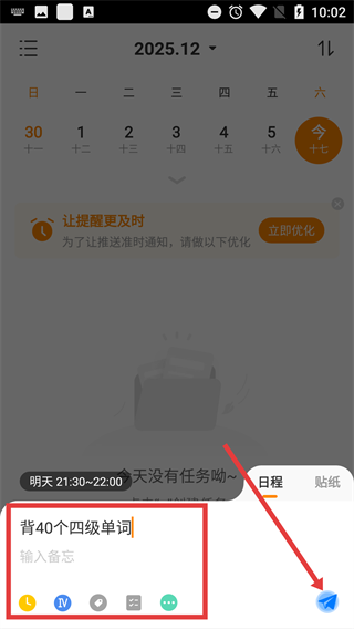 4、在任务输入框中填写“背40个四级单词”的内容后,点击发送按钮,即可完成该日程任务的创建与保存。
