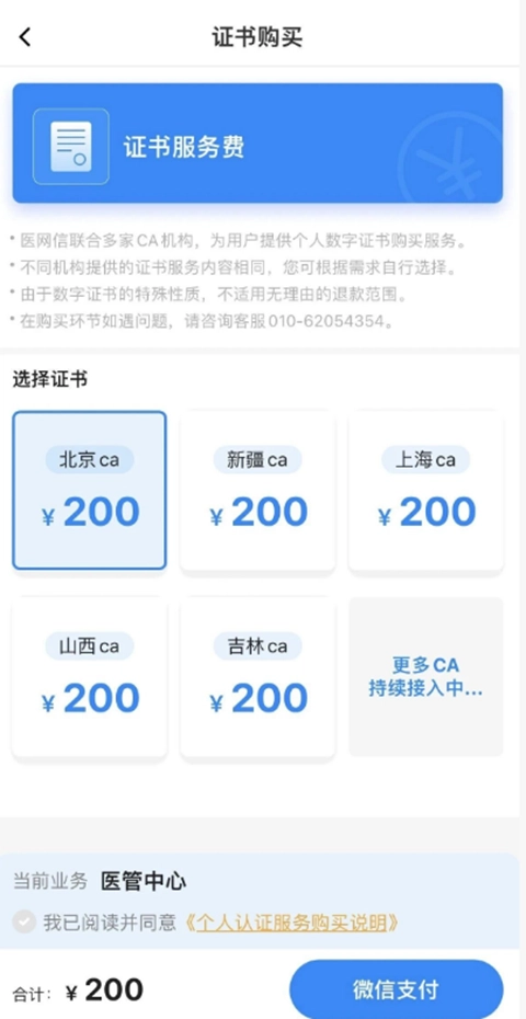 目前医网信证书支持多个CA证书渠道,用户能够依据自身需求选购。例如:选定北京CA后,点击微信支付完成付款(支持公务卡支付,支付订单时选择对应的公务卡就行)。