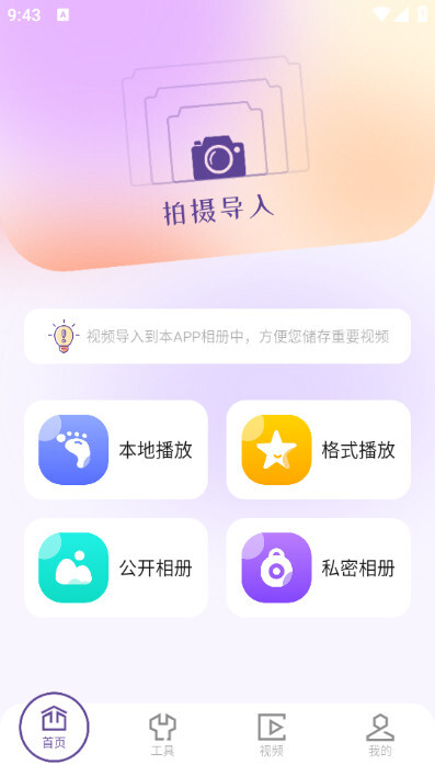 1.安装完成后,您可以在首页挑选所需的功能,比如本地播放、格式播放、公开相册、私密相册等。