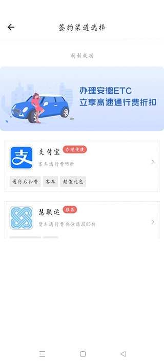 安徽的车主可通过安徽ETC手机版在线办理ETC业务(全程免费),点击【ETC办理】按钮后,第一步是选择签约渠道。