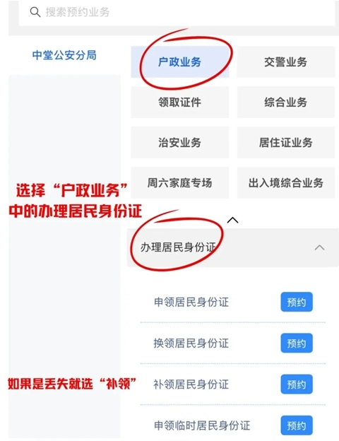 4、在“户政业务”板块中找到办理居民身份证的选项,接着依据自身实际情况挑选对应的预约业务。