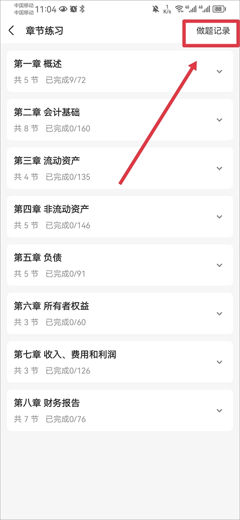 3、接着在章节练习目录界面中点击右上角做题记录