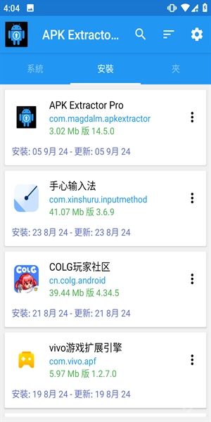 打开安卓版的APK提取器后,会看到这样的界面,界面上显示的所有软件都是以APK为后缀的安装包。