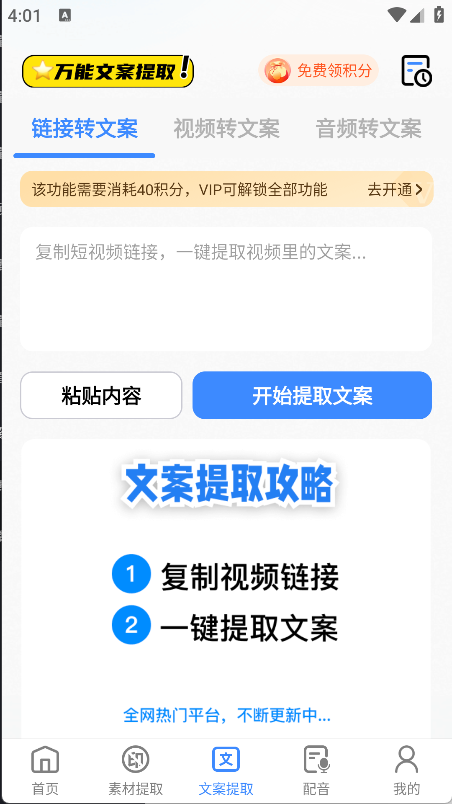 - 文案提取:支持从链接、视频、音频等全网热门平台提取文案。