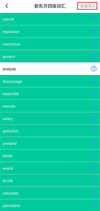 4. 进入对应的界面后,可点击右上角的“批量导入”功能按钮来导入单词。
