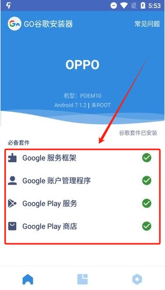 4、安装完成之后,能够看到提示“谷歌服务已安装”