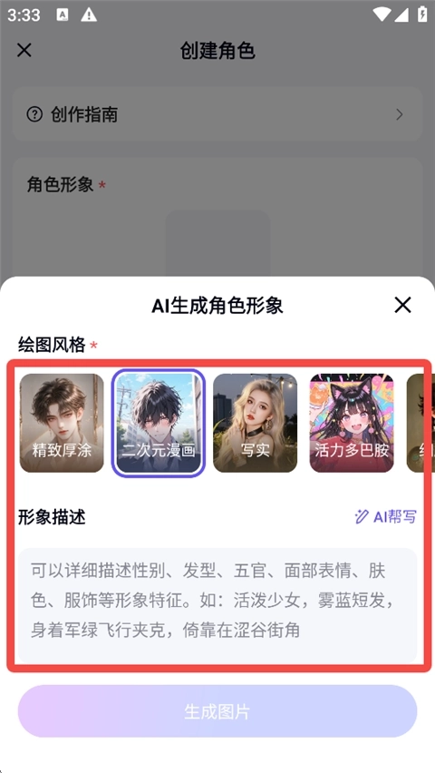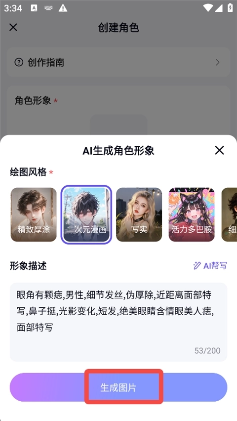 4、拿"AI生成"来举例,首先要明确自己角色的长相风格,接着再对性别、面部神态、肤色、服装等形象特点展开个性化设置。