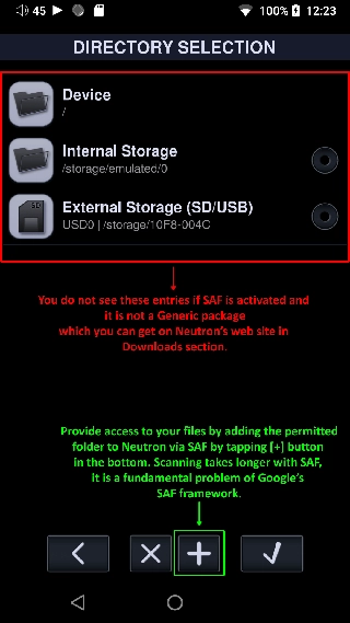 2、如果您在Android11+上使用2、19+版本,那么您将看不到Device或SD,只能访问Neutron的内部文件系统(沙盒),您可以通过在网络设置中激活内部FTP服务器来访问它,点击底部的[+]以添加允许Neutron访问的文件夹