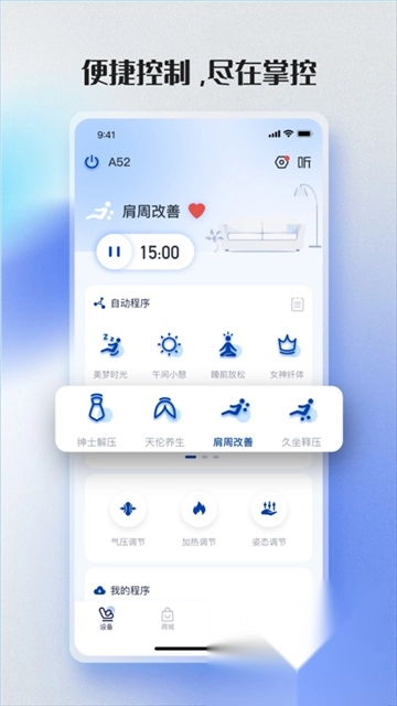 荣泰智能是荣泰品牌为旗下智能设备打造的专属控制软件,主要用于连接按摩椅、按摩器等产品。用户在手机上安装该软件后,添加对应的按摩设备,就能直接通过手机操控按摩椅的自动程序,像颈肩舒缓、肩周改善、久坐释压等模式都可以自由切换,使用起来十分便捷。