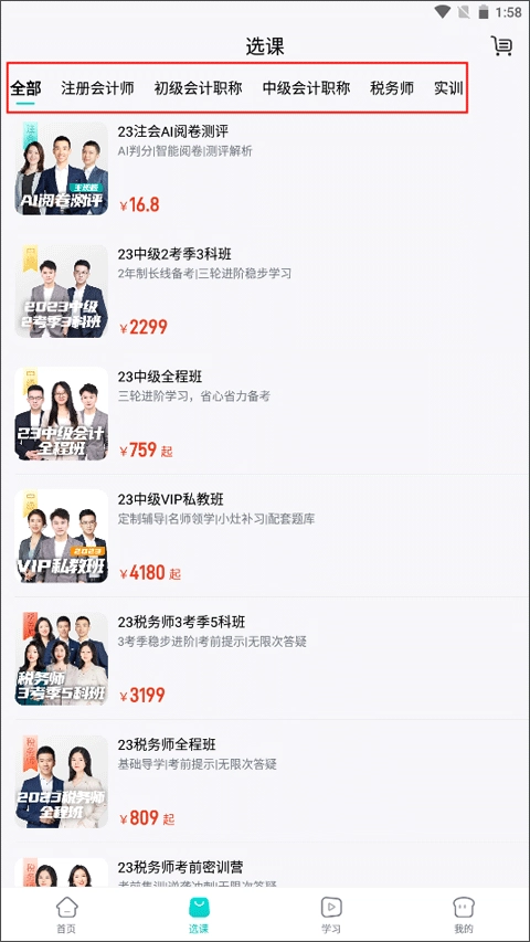 1、进入【选课】界面,从全部、注册会计师、初级会计职称这几个分栏中选择你要购买的课程类型。