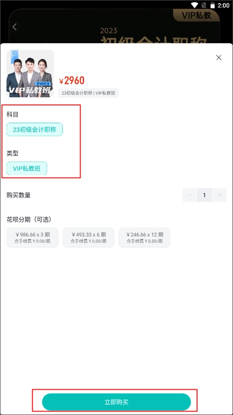 3、选择你要购买课程的科目、类型、花呗分期(可选),最后点击立即购买。