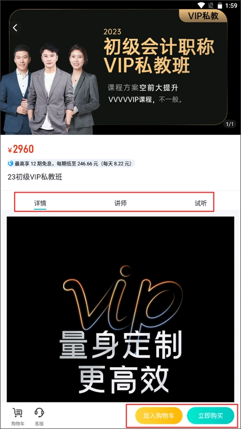 2、在课程的详情页面中了解讲师以及课程的主要内容,点击下方的加入购物车或立即购买进入的课程选择页面。