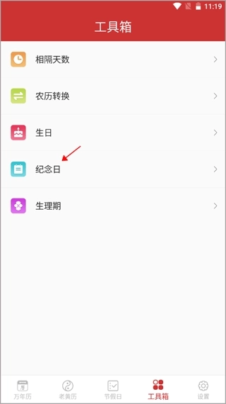 1、选择软件中的工具箱模块,这里面有很多的小工具,选择“纪念日”。