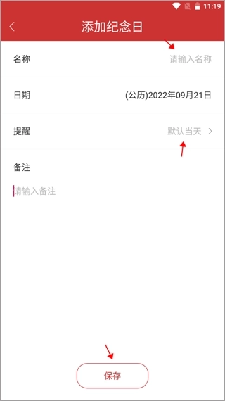 3、输入纪念日名称,提醒时间,最后进行保存,保存后就可以纪念日列表查看了。