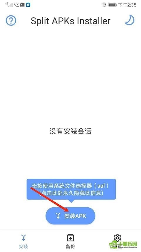 4、接着我们打开SAI安装器,进入应用主界面,包括安装、备份和设置栏目,在安装栏目选择【安装APK】选项,
