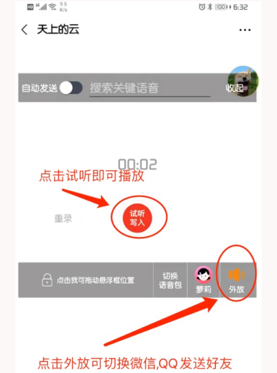 3、录制结束后,就能试听变声效果,也可以把录音发送给QQ、微信好友。