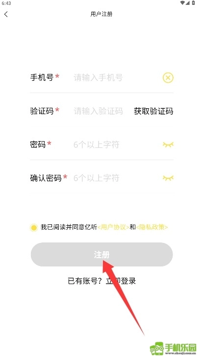 1、输入手机号和验证码并设置登录密码,勾选同意相关协议后点击注册。