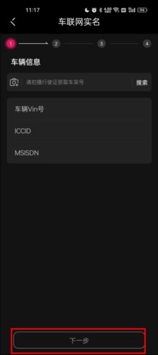 5、接下来会进入车辆信息绑定页面,填写车辆的车架号、VIN号、ICCID、MSISDN等信息后,点击下一步并按照软件指引完成认证,最终即可实现车辆连接。