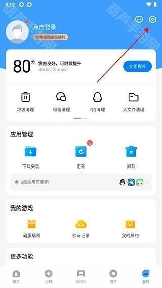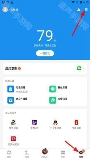 1.打开应用宝,在管理页面点击右上角的菜单选项。