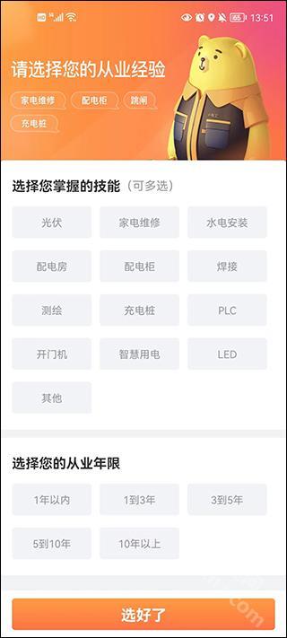 电工师傅在使用软件时,可选择自身的专业技能与行业经验,让系统据此分配合适的订单。