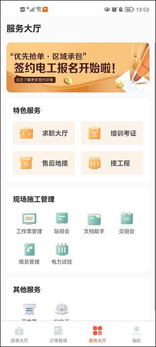 4、服务大厅可提供求职、培训、承接工程等服务,同时具备工作票管理、站班会、文档助手等功能。