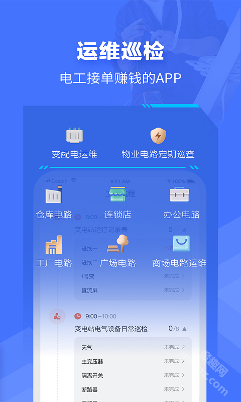 2、施工现场管控:具备施工现场管理相关功能,可帮助电工更高效地对施工现场实施有效监控。