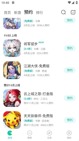 3、在预约板块中,会展示未来几天即将上线的游戏,你可以查看是否有自己感兴趣的,并进行提前预约。