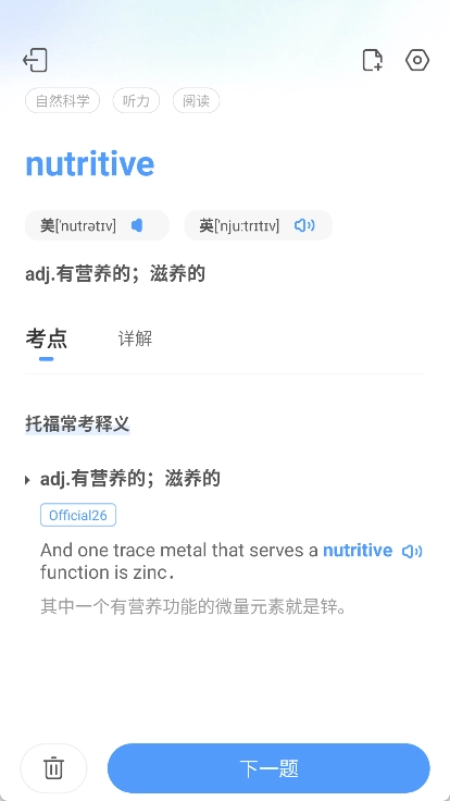 托福单词是一款专为托福考试打造的背单词软件,能助力我们高效记忆单词、积累各类考试专用词汇,让我们在考试中更从容应对。托福单词安卓版的词汇覆盖天文、地理、历史等多个领域,还运用科学的记忆复习方法,通过合理规划复习安排,帮助我们切实记住所学单词。另外,我们可以依据自身时间和实际情况制定个性化学习计划,即便在不同设备之间也能同步学习进度。