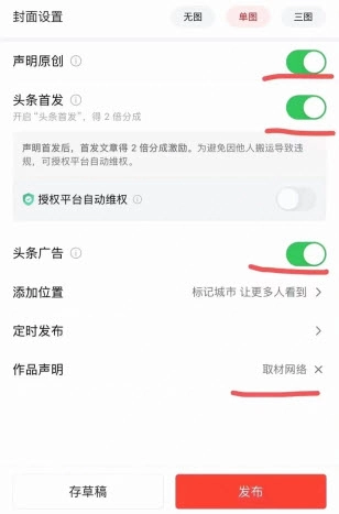 4、点击下一步,勾选“原创”“头条首发”以及“头条广告”选项,若不勾选这些选项将无法获得收益。