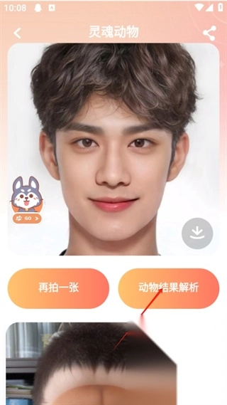 3、拍摄完成后,系统会自动识别并更改形象,把照片变成带有个人特色的小动物,要是想保存的话,点击右下角的位置就行。