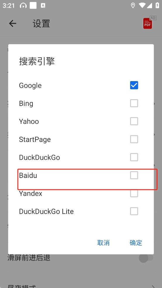 3、找到搜索引擎设置项,把google替换成baidu,这样默认搜索引擎就会从谷歌切换为百度,就能在国内正常使用了。