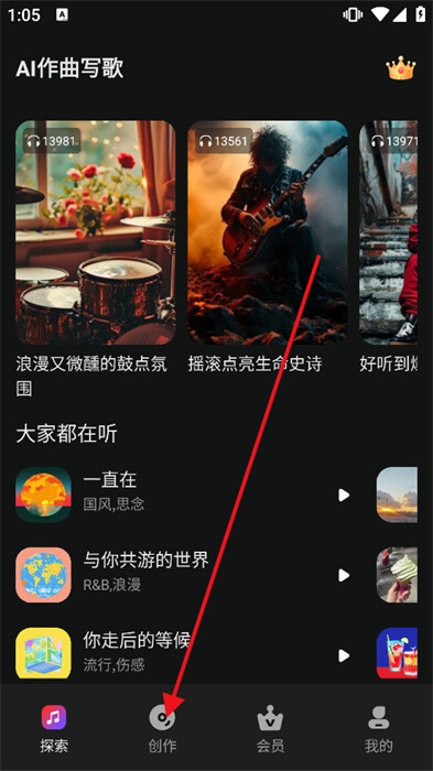 2、接着,进入首页并切换至【创作】页面,这个页面的设计风格十分清爽。
