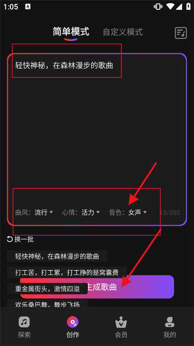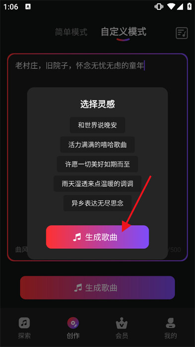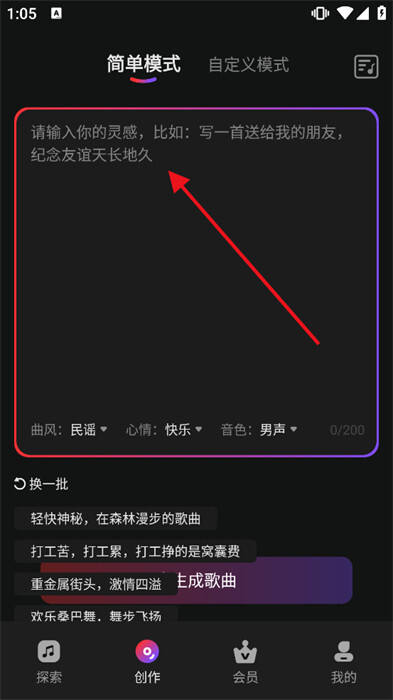 3、创作歌曲很简单,只需输入关键词和创作意向就行,并且还支持二次编辑。