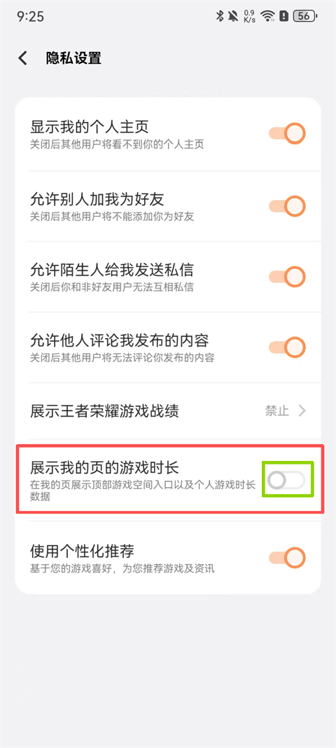 3、在隐私设置页关闭下方的【展示我的页的游戏时长】即可。