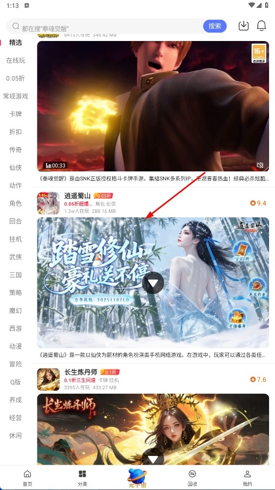 2、进入分类页面后,浏览仙侠类等不同类型的游戏,挑选出目标游戏并进入其详情页。