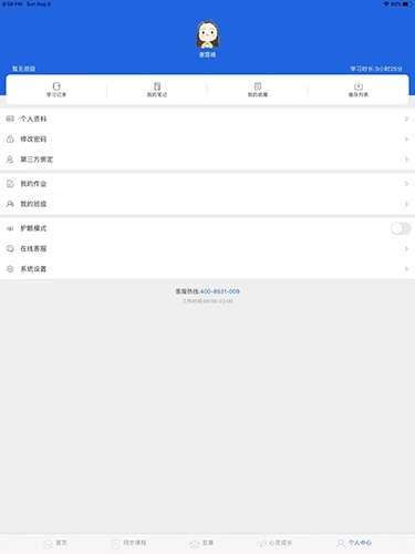 6、展示个人学习总时长数据,在个人中心呈现自己的总学习时长以及有效期信息。