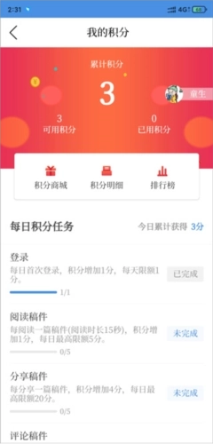 2、点击积分板块,即可查看获得的积分,以及每日的积分任务