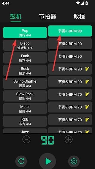1、完成安装并进入鼓机界面后,左侧呈现的是各类不同的音乐风格选项,右侧则对应着多种不同的节奏类型。